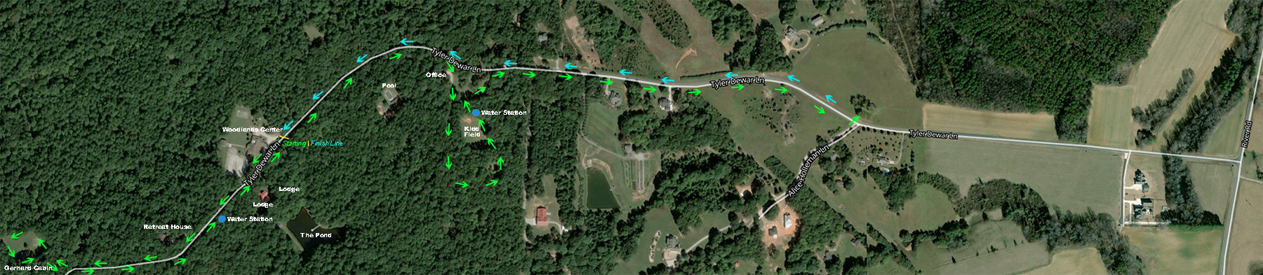 The race kicks off at the Woodlands Center, taking you down a gravel road toward the Gerhard Cabin. After a loop around the grassy field there, racers will tackle a tough hill on the same gravel road, heading back toward the campground loop and Kidd Field. From Kidd Field, runners will hop back onto the gravel road, which turns into pavement as you cruise through the Camp Agapé entrance gates. Once you make the turn just before Alice Holleman Road, it’s mostly downhill on pavement, with gravel leading you to the finish line. *Green arrows on the map represent from start to turn at Alice Holleman. Blue Arrows represent from Alice Holleman to finish line.
