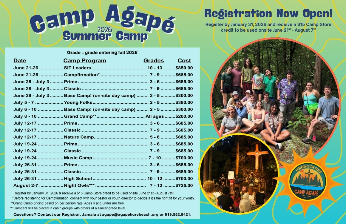 For more information: call the office at (919) 552-9421 ext. 111, or email Jamala at agape@agapekurebeach.org